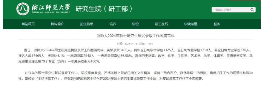 分析:浙江师范大学的一志愿录取率略低于西安财经大学,但全日制专业学位的录取人数较多,说明该校在专业学位教育方面投入较多资源。