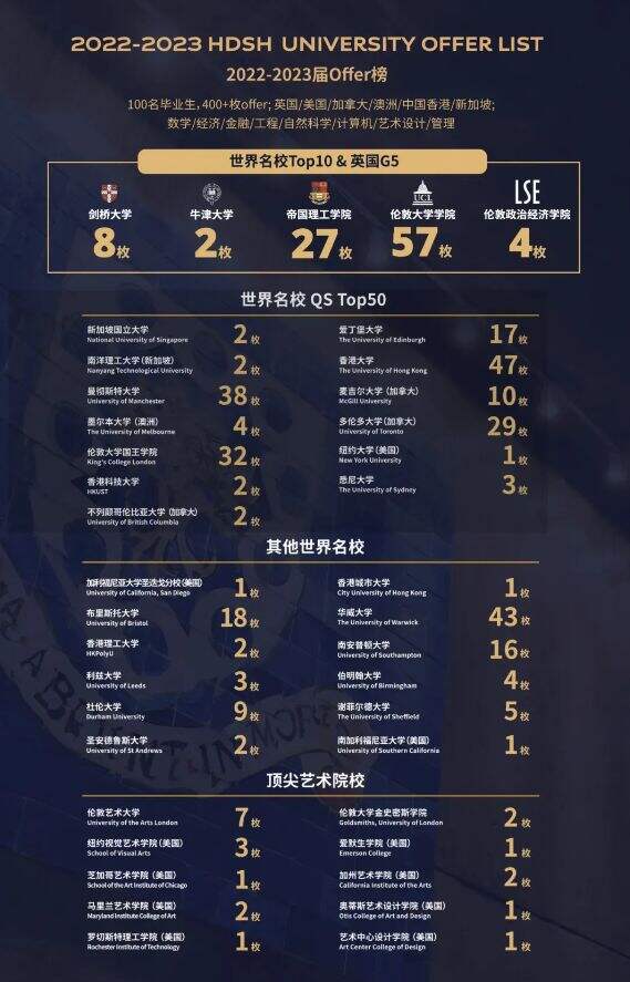 上海赫贤学校过往两届即2022届和2023届毕业生共计100人,收获了400余份来自英国、美国、加拿大、澳大利亚、新加坡、中国香港等国家和地区知名大学的录取,包括8枚剑桥大学、2枚牛津大学、27枚帝国理工学院、57枚伦敦大学学院及4枚伦敦政治经济学院录取,55%的毕业生成功进入英国G5大学,70%的毕业生进入QS排名世界前30大学就读。
