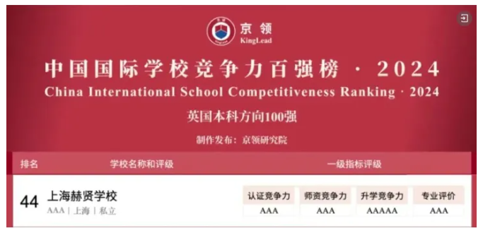 上海赫贤学校荣登京领2024中国国际学校竞争力百强榜·英国本科方向,排名44,获得AAA级评级。