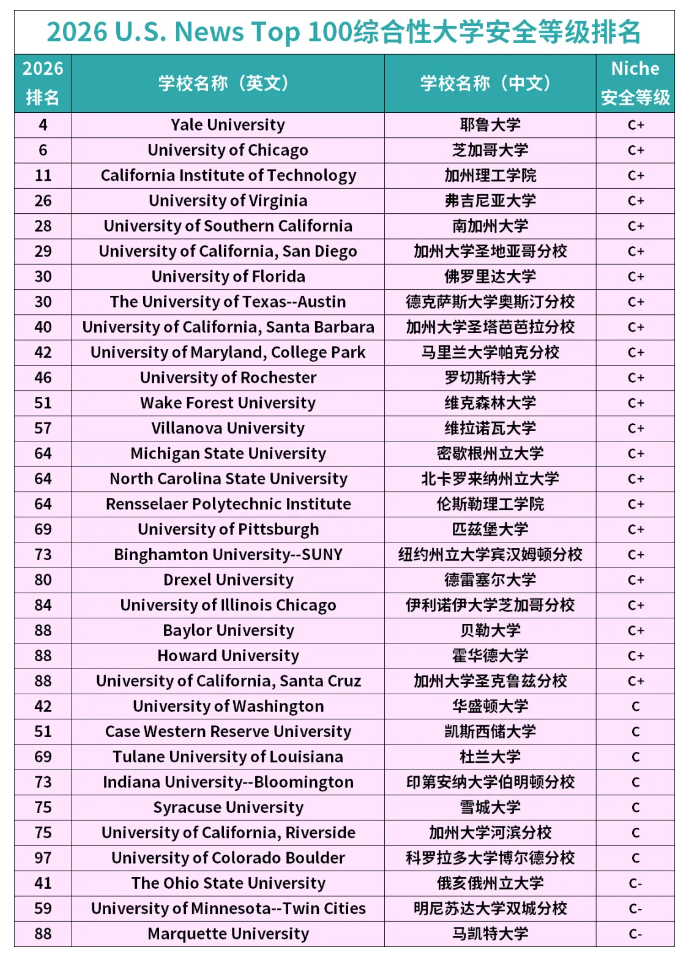华盛顿大学、凯斯西储大学等7所院校获C级评级,俄亥俄州立大学、明尼苏达大学双城分校、马凯特大学获C-级评级,这些院校校内安保基本到位,但周边环境或部分区域存在明显安全风险,需提高警惕。