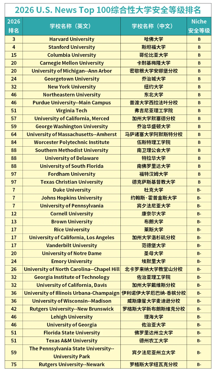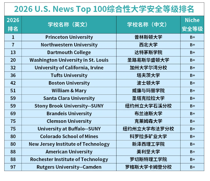 二、顶级(Niche等级B+):18所名校入围,整体安全表现优秀