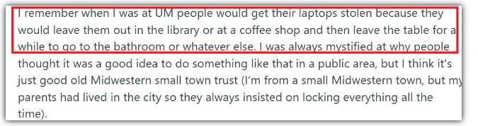 密歇根大学安娜堡分校(U.S.News排名20)被誉为"美国公立教育天花板",是典型的"大学城",设有校警部门和校园公共安全与保安部门双安保机构,24小时巡逻保障师生安全。不过需注意财产安全,曾有学生在图书馆丢失笔记本电脑,建议贵重物品不离视线。