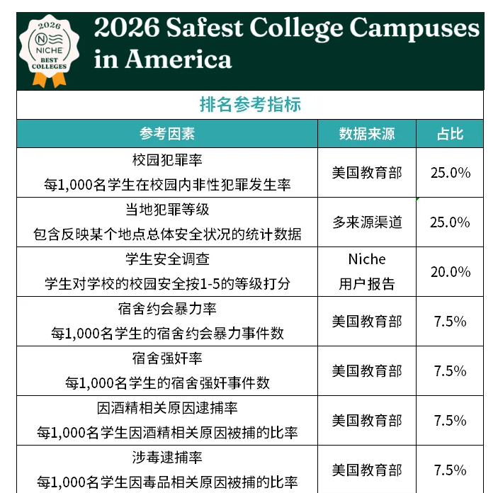 知名美国院校评价平台Niche每年都会依据权威数据发布"校园最安全大学"榜单,2026年的排名已新鲜出炉。该排名参考7大核心指标,其中校园犯罪率和当地犯罪等级各占25%权重,学生安全调查占20%,宿舍暴力、强奸率及涉酒涉毒逮捕率等各占7.5%,数据来源包括美国教育部、多渠道安全统计及Niche用户报告,权威性十足。