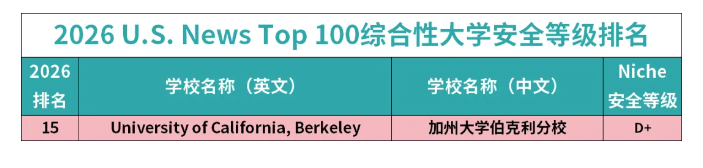 加州大学伯克利分校(U.S.News排名15)是全美Top100中唯一获D+评级的大学,成为安全风险最高的院校。
