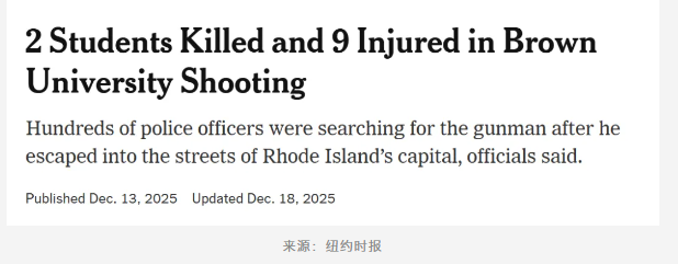 2025年12月,布朗大学工程学院大楼发生恶性枪击案,造成2人遇难、9人受伤;
