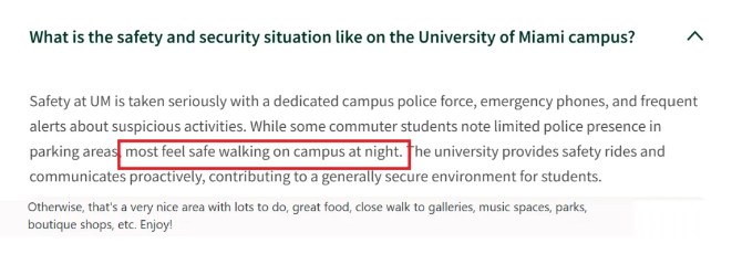 迈阿密大学(U.S.News 排名 64)位于迈阿密富人区,环境优美且安保给力,校警 24 小时巡逻、紧急电话直通安保中心,与本地巴士合作保障学生夜间通勤安全,还被评为全美学生生活质量 Top8,安全与舒适度双高。