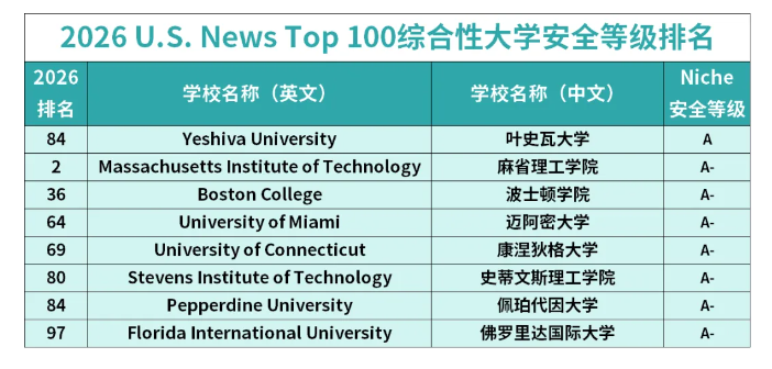 全美 Top100 综合性大学中,仅叶史瓦大学斩获 A 评级,另有 7 所高校获得 A-,堪称安全标杆。