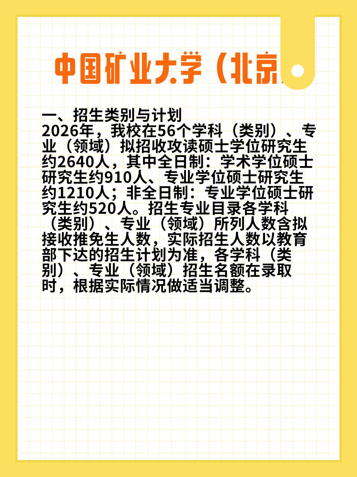 2026年拟招约2640人!全日制学术型910人、专业型1210人;非全日制专业型520人。注意哦,招生目录人数含推免生,实际名额以教育部下达为准,录取时可能微调~