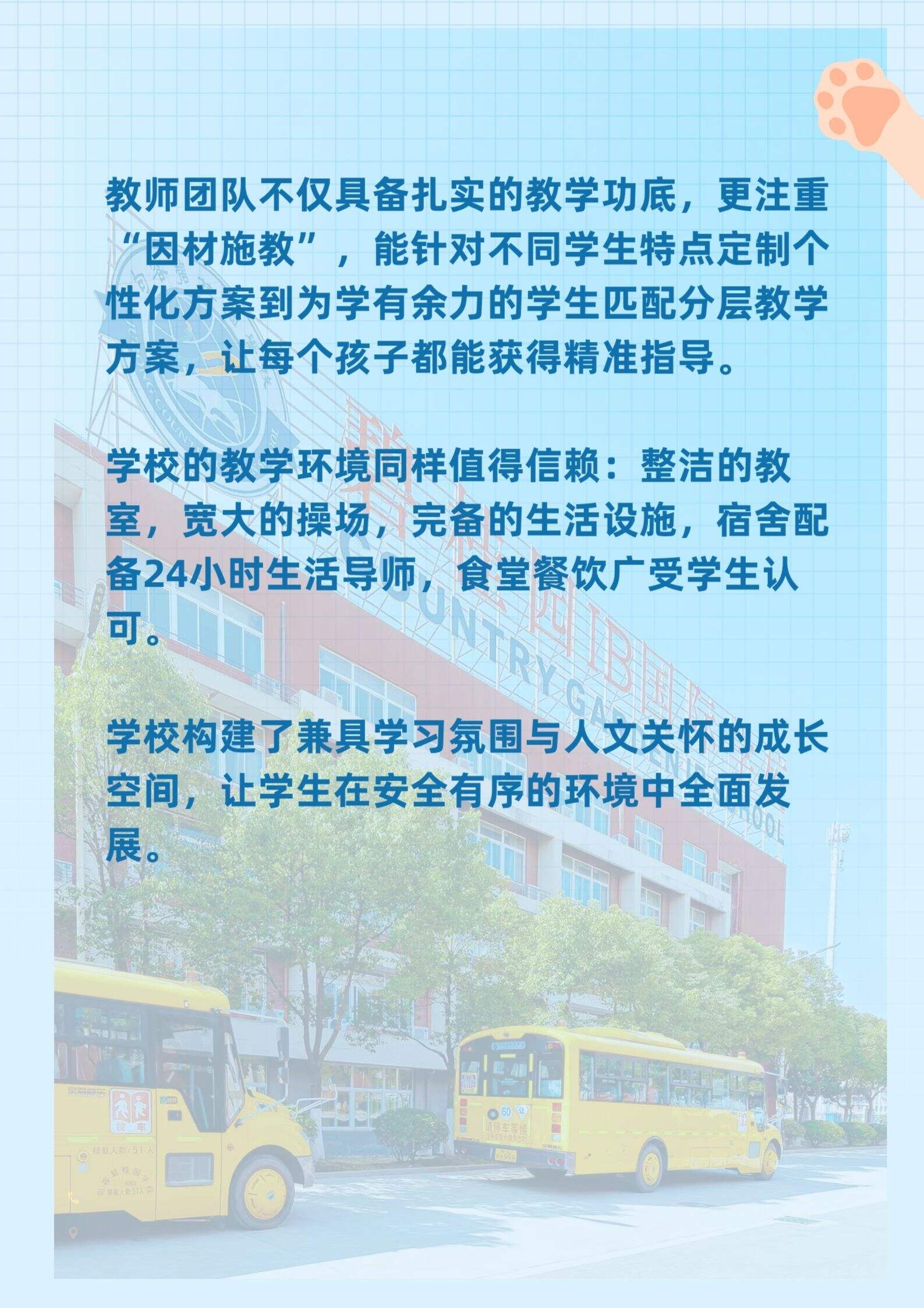 在师资与教学层面,学校的专业细致更显诚意。教师团队不仅教学功底扎实,更精于“因材施教”——为不同特点的学生定制个性化方案,为学有余力的孩子匹配分层教学计划,让每个孩子都能获得精准指导。而学校的教学环境同样值得信赖:整洁的教室、宽大的操场、完备的生活设施,宿舍配备24小时生活导师,食堂餐饮广受学生认可……这里构建的是兼具学习氛围与人文关怀的成长空间,让学生在安全有序的环境中全面发展。