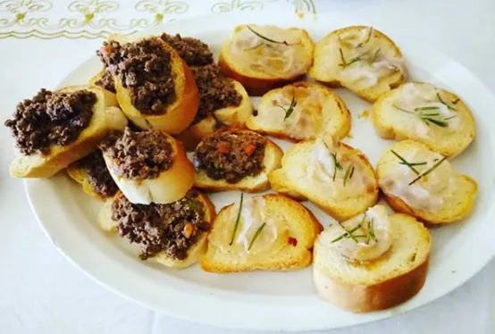 这是一道叫 crostini 的开胃菜,底部是托斯卡纳面包,这种面包味道单一,比其他面包 更适合与各种调味料和酱汁搭配在一起,形成对比。黑面包丁就着肉酱馅吃。你们敢不敢来尝一尝?