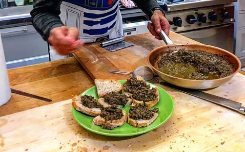 Antipasto chiama crostini, La base è il pane toscano, il pane sciocco si presta dunque meglio di altri a reggere il contrasto con salse e condimenti di ogni tipo. Nel caso dei crostini neri, il companatico consiste in un ibrido ragù-patè. Avete il fegato di assaggiarla?