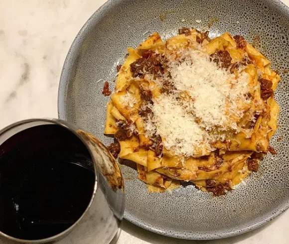 这种极具特色的托斯卡纳鸡蛋面的菜名源自 pappare,意思是“大口地吃,贪婪地吃”,是个非常可爱的拟声词,这让人对这道菜非常有好感。Papardelle 用的面条原材料是鸡蛋,再加水和面粉混合而成。面条很宽,一般是2厘米宽,最宽的有4厘米,摸起来很粗糙。如果你很有幸在托斯卡纳尝到这道菜,可以选择一种野猪肉酱搭配着吃。