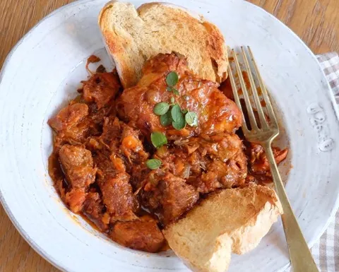 这道炖肉的食材来源于山脉,栗子树林和牧场,有的也会放一些沿海鱼类一同烹制。菜里有鸡肉,猪肉,小牛肉,火鸡,兔子,羊肉(有些食谱会写“各种肉类”),用小火慢慢煮熟。加番茄和红酒让菜色变深且多汁,因此得名肉糜鱼汤(cacciucco di carne)。