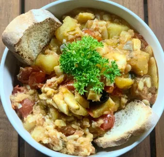 Stoccafisso alla riese是托斯卡纳群岛上的特产:鳕鱼干用砂锅装盛,砂锅最好是红土陶器,放入番茄,橄榄,土豆和欧芹煮熟。这道菜有个调味小技巧,是将鱼皮和胃切成小块放入:食谱更加丰富,味道也多了层次。