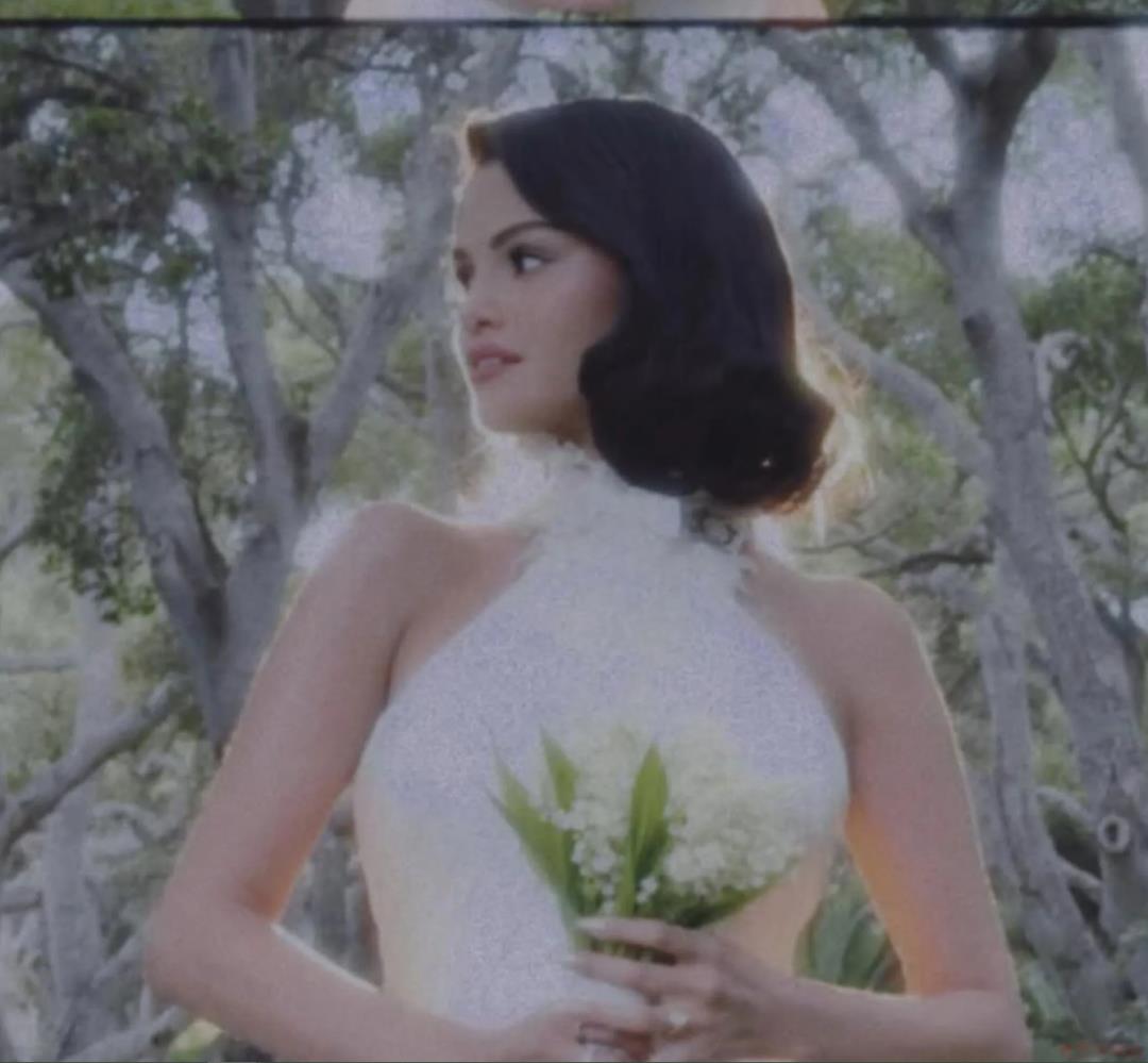 The photos show the newlyweds embracing, holding hands and soaking up the moment. One shot features a close-up of Gomez's simple bouquet of white flowers, while another highlights her dazzling wedding bands.