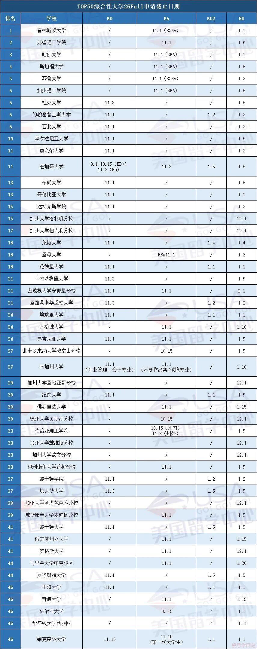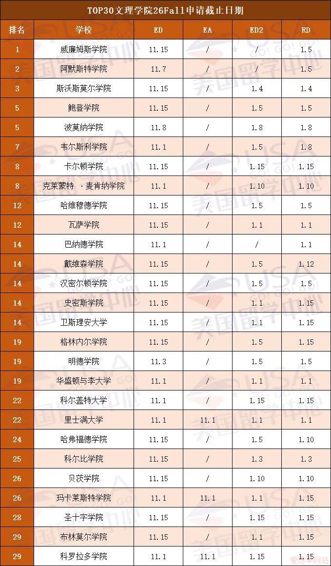 接下来,大家拿小本本记好,美国Top50综合大学和Top30文理学院申请截止时间出来了!