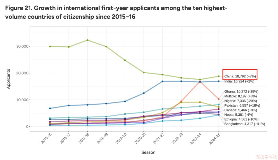 尽管如此,来自中国的申请人数在国际关系持续波动的情况下,却终止了此前六年持续下降的势头,相较23-24年增长了7%,依然保持着美国第一大国际生源国的地位。