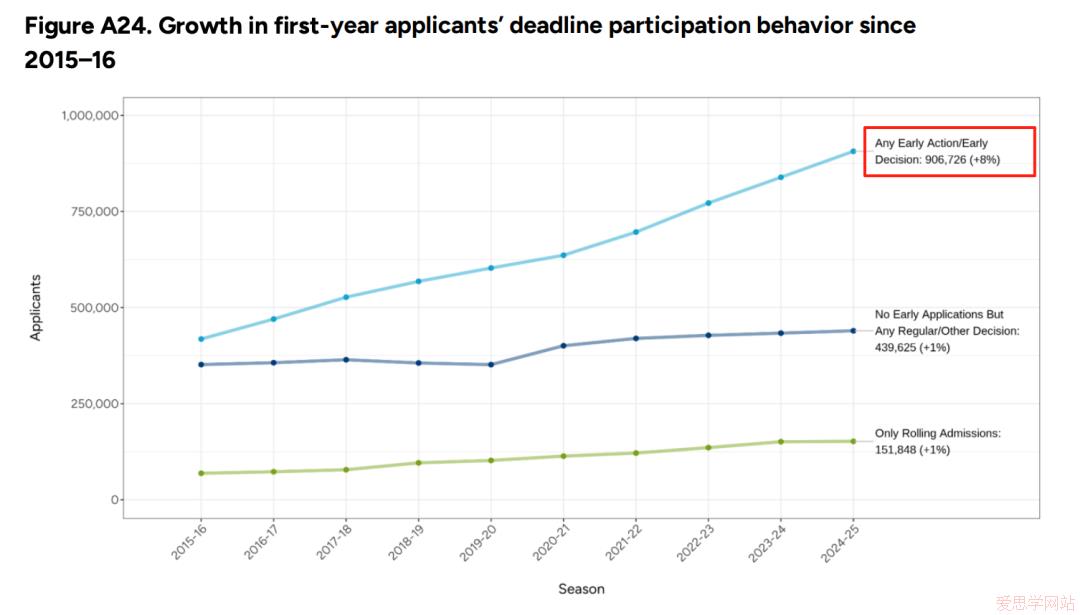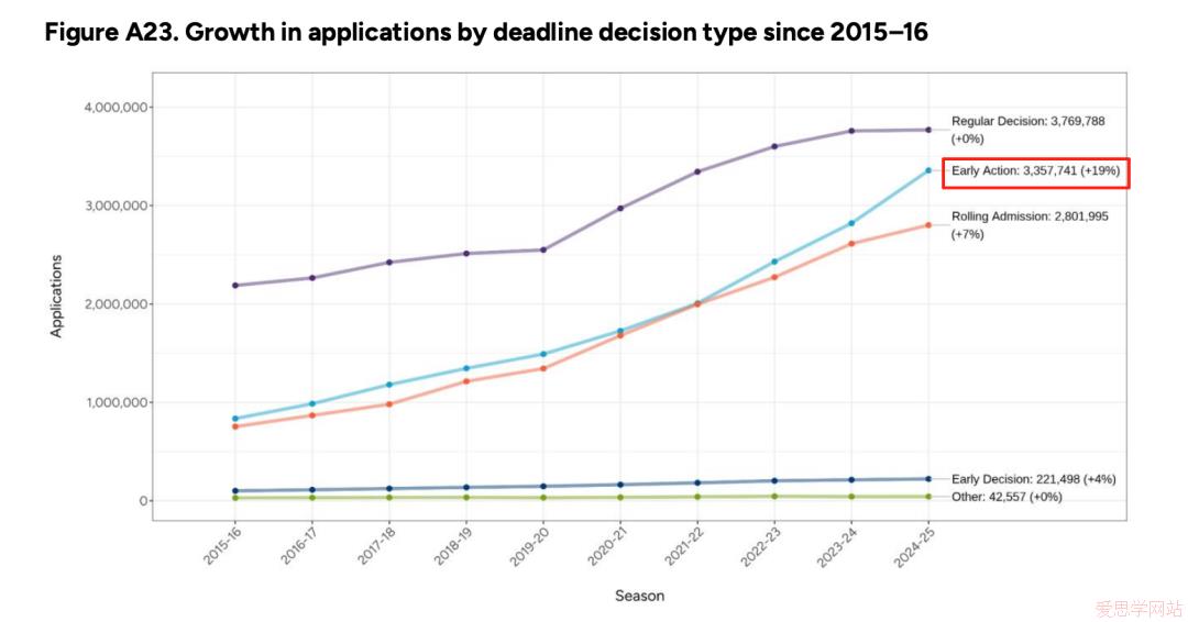 根据数据,24-25申请季选择在EA阶段提交申请的学生人数对比上个申请季增加了19%,远超其他各个阶段的申请人数增长变化。