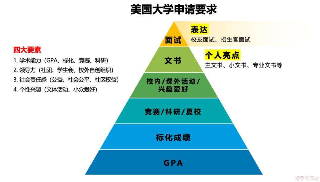 美本录取要素可分为四个层级,越往下越基础,越往上越能让你脱颖而出: